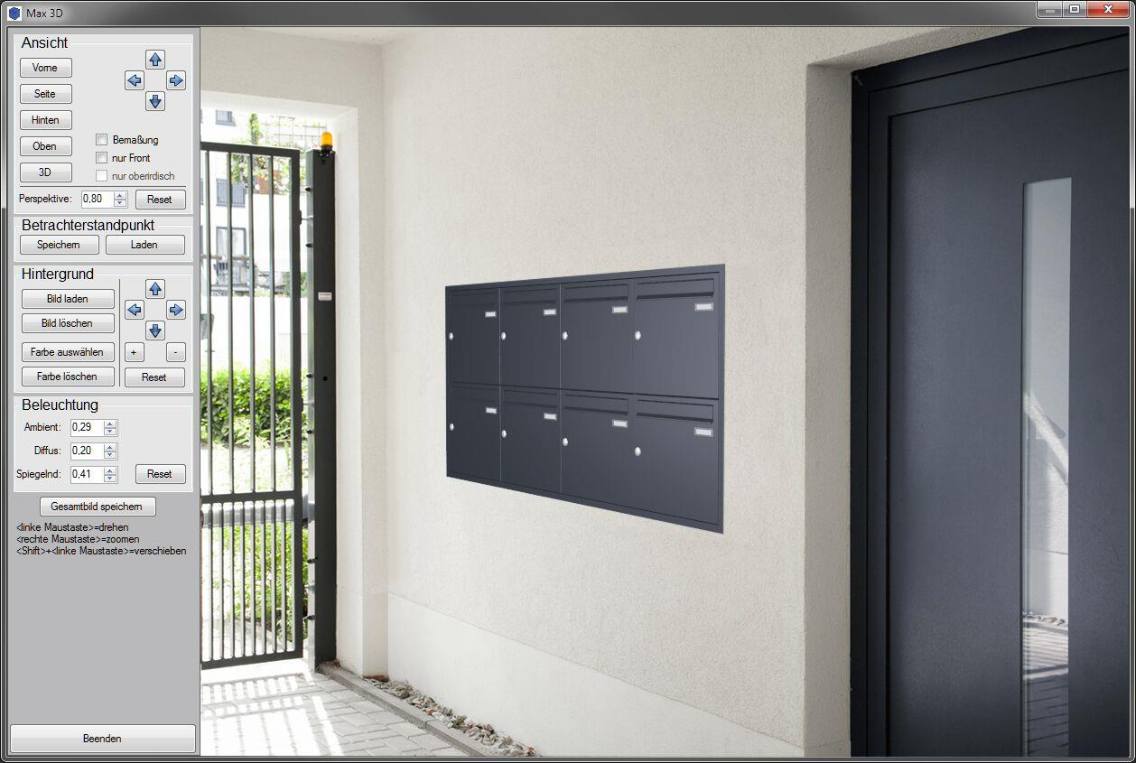 Briefkastenanlagen und der kompletten Eingangslösung vermittelt. Einfach ein Bild von Ihrem Hauseingang machen und ins „MAX“ laden. Dann können Sie sich Ihre selbst konfigurierte Briefkastenanlage an die gewünschte Stelle schieben und bekommen eine sehr reale visuelle Vorstellung, wie die Briefkastenanlage tatsächlich aussehen und wirken kann.