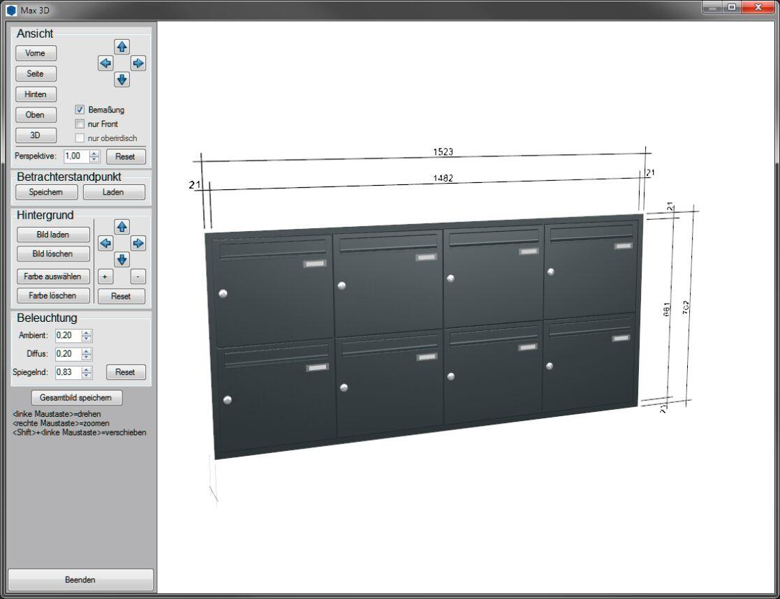 Endlich selber Briefkastenanlagen planen! Mit der Software "MAX" brauchen Sie nur noch einen Computer und schon tauchen Sie in die fabelhafte Welt der Briefkästen ein! Mit der Konfigurations- und Grafiksoftware MAX für Briefkastenanlagen bieten wir Ihnen eine Serviceleistung, mit der Sie Ihre Ideen verwirklichen können.